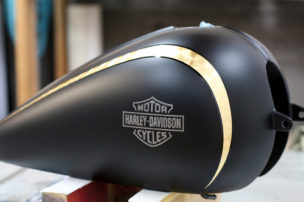 今回のピンストライプは、シンプルでありながらも流れるような優雅な曲線を描き、バイク全体に上品な雰囲気をプラスしています。また、「Harley Davidson」のロゴは、手描きレタリングで施され、既製のステッカーでは味わえないオリジナリティを演出。バイクの持ち主のこだわりやセンスが細部にまで宿る、特別な一台へと生まれ変わりました。